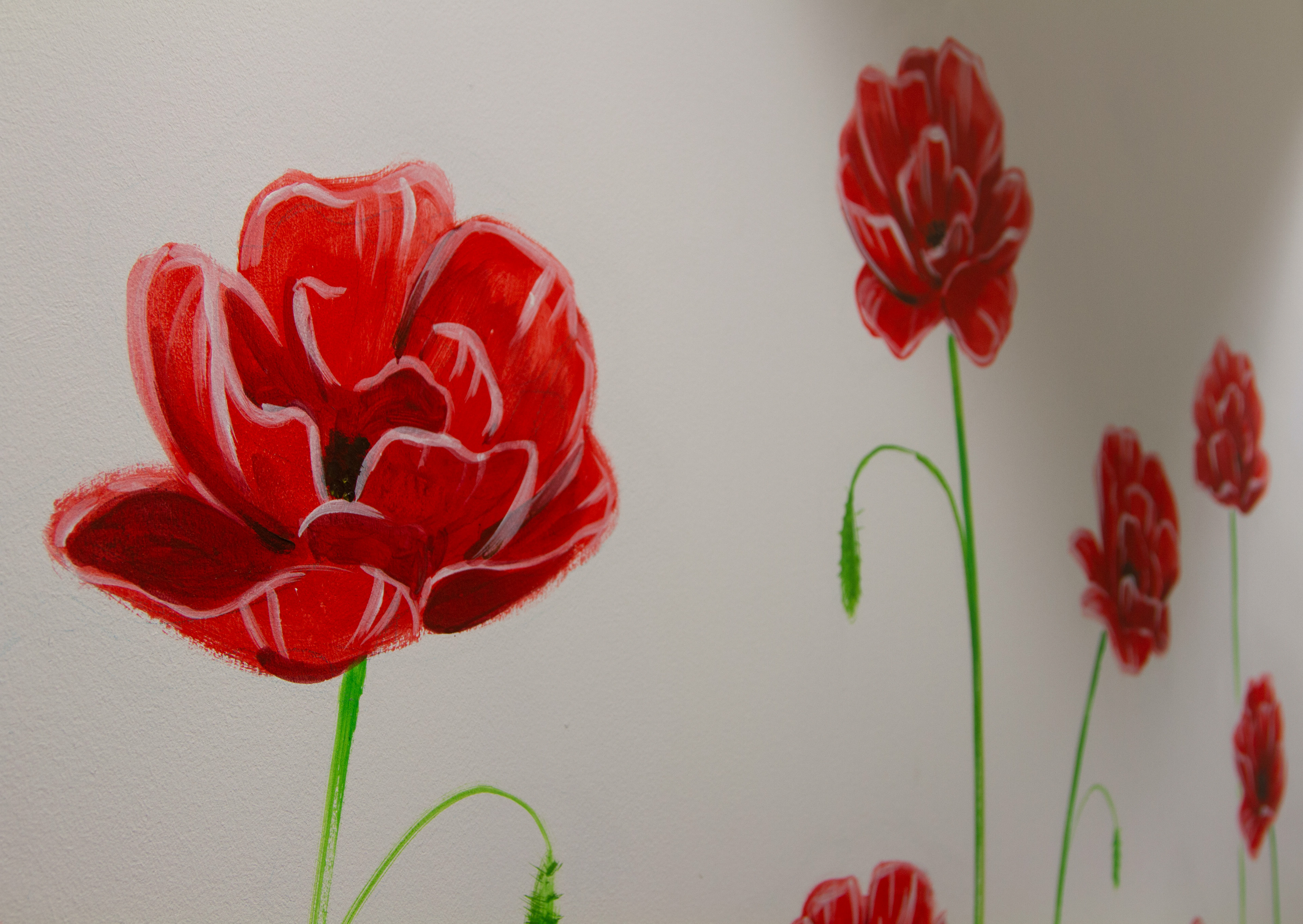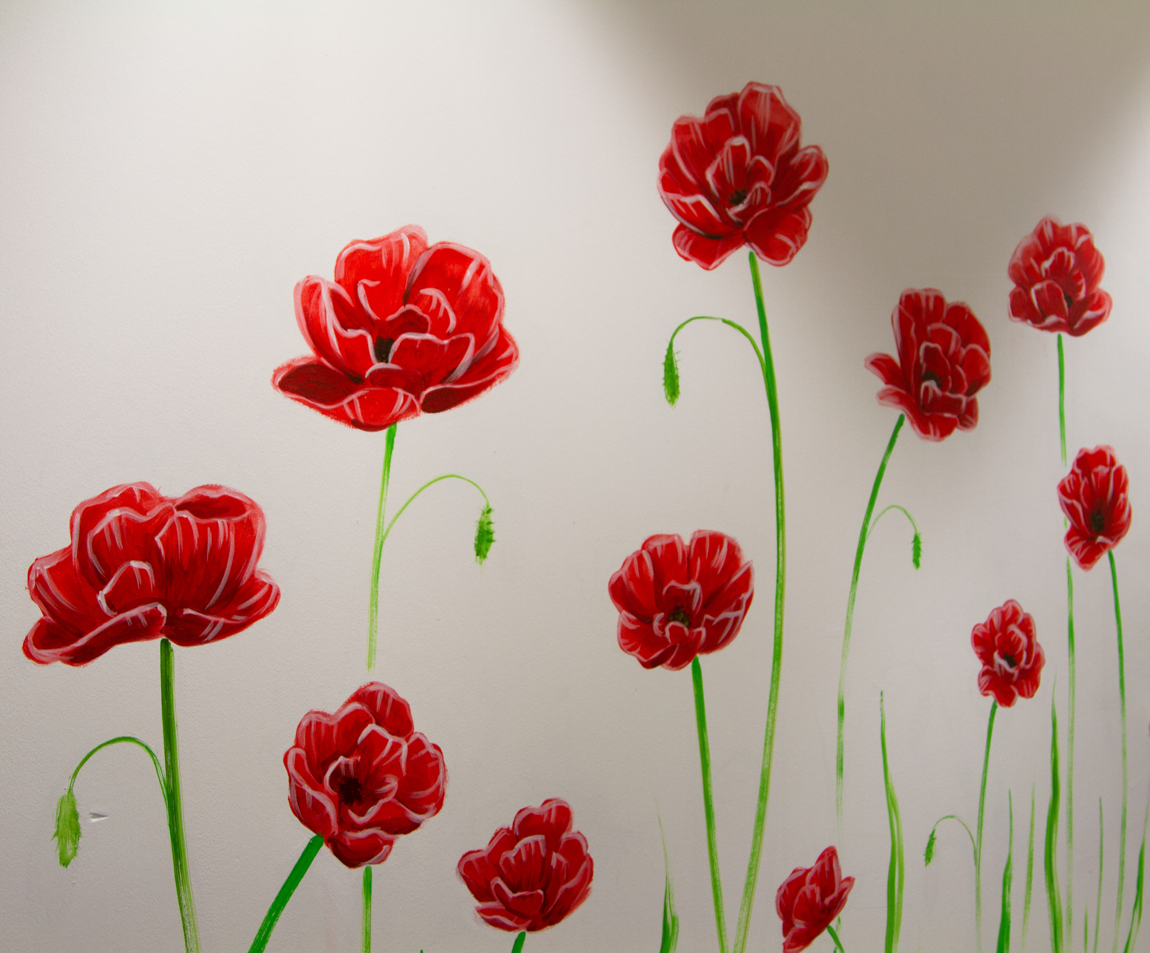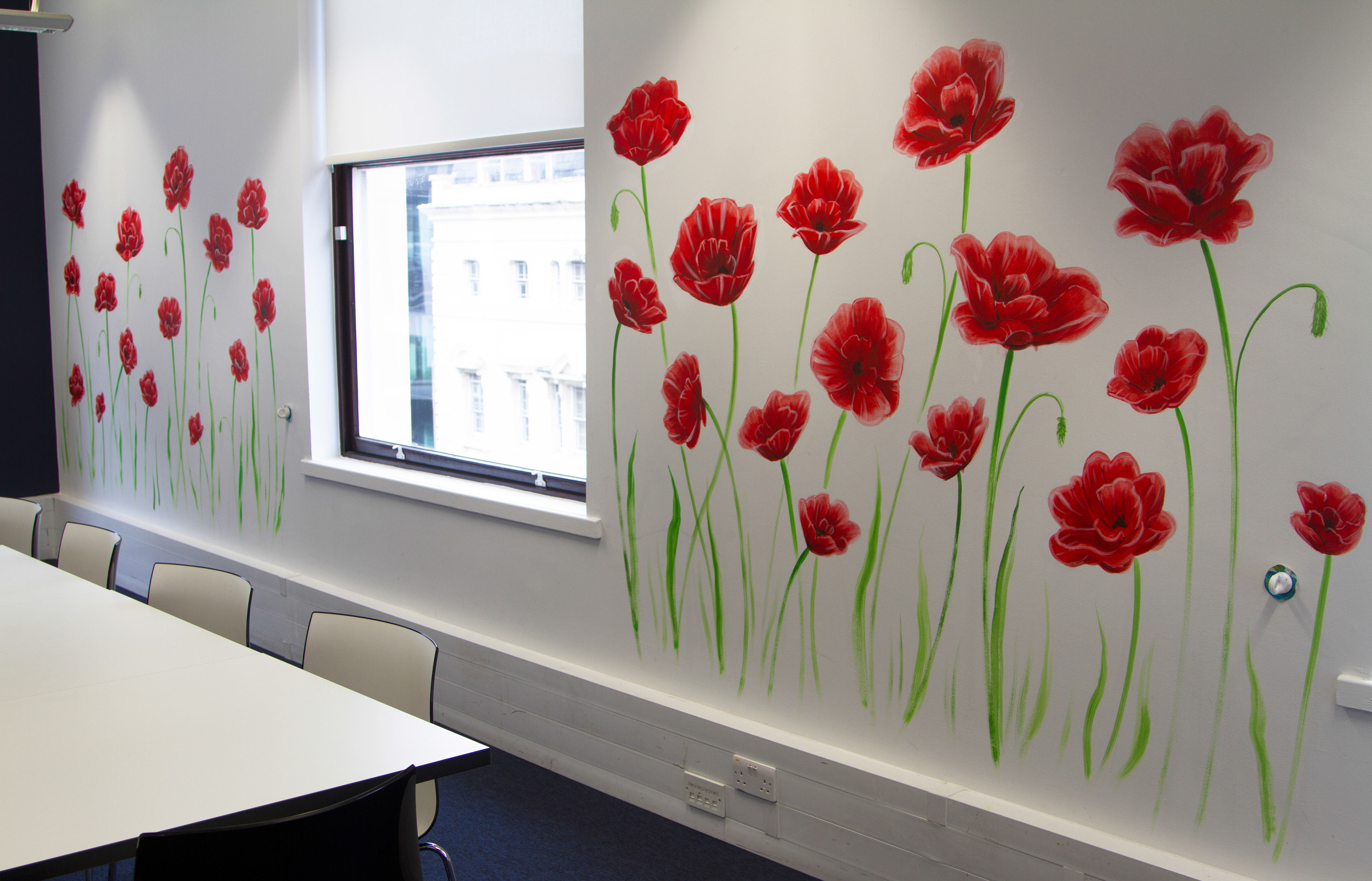 I gave this meeting room a fresh appearance by painting giant poppies on the walls.